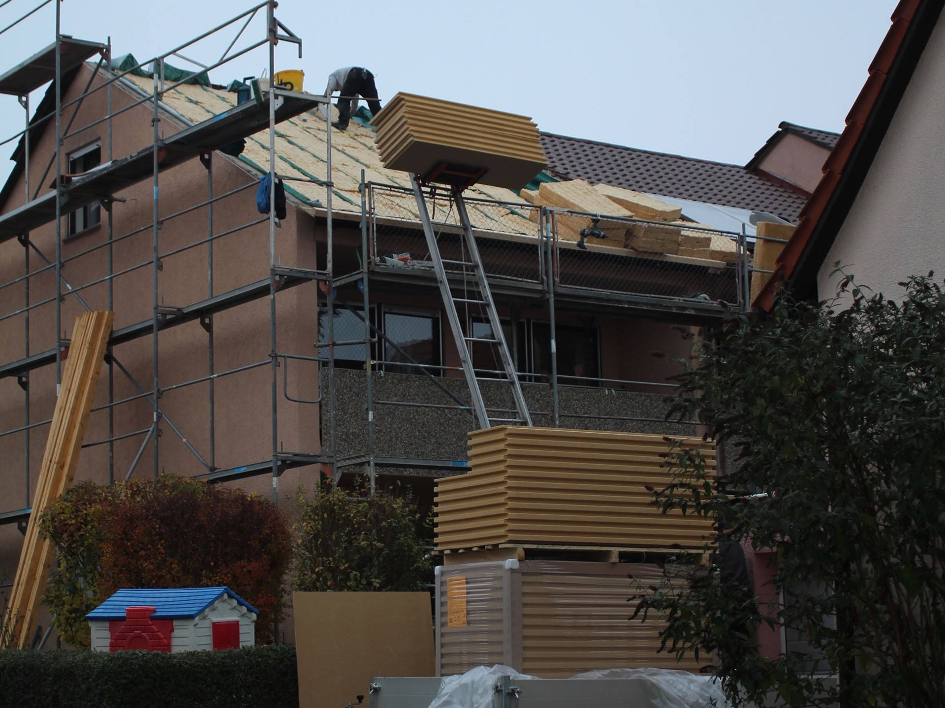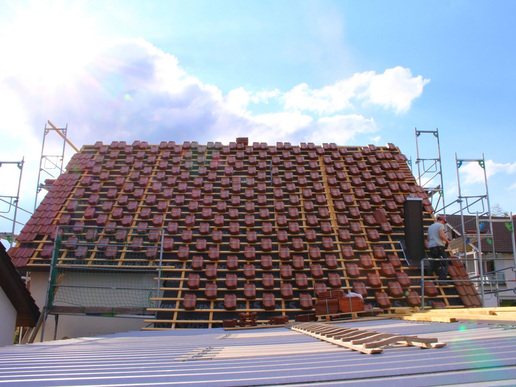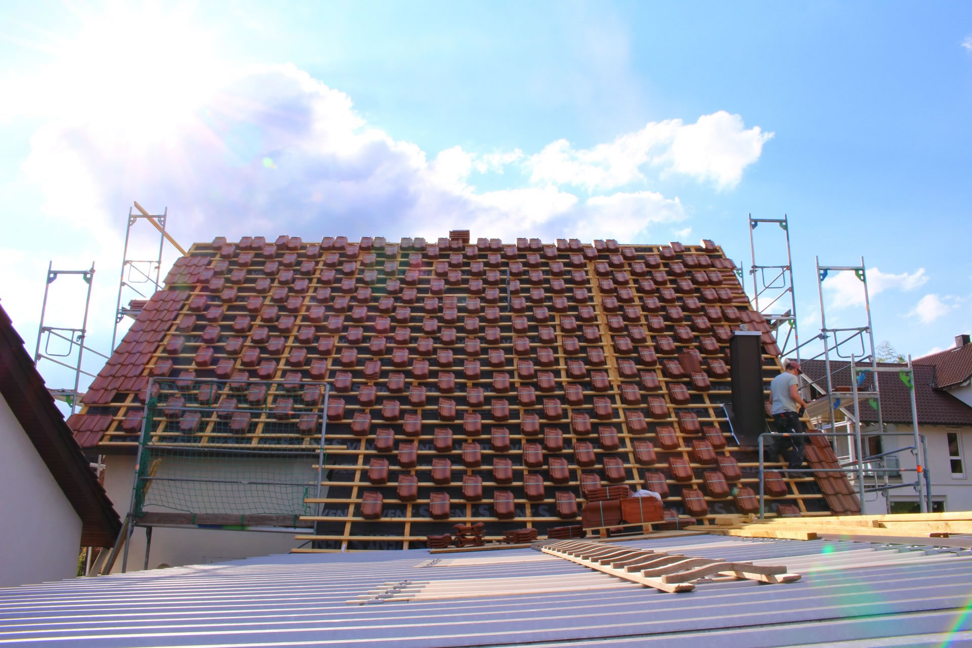 Hierbei decken wir im Normalfall nicht nur die Ziegel um, sondern dämmen auch nachträglich den Dachstuhl, denn bei den meisten alten Häusern ist keine oder eine nicht mehr ausreichende Dämmung des Daches vorhanden. Dadurch entweicht viel Wärmeenergie und auch der Hitzeschutz im Sommer ist nicht gegeben.