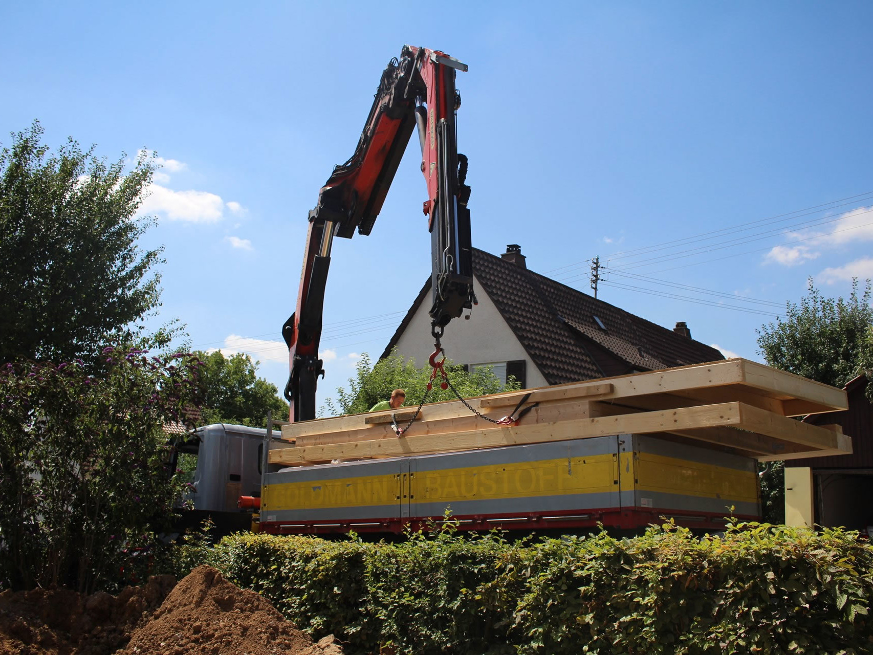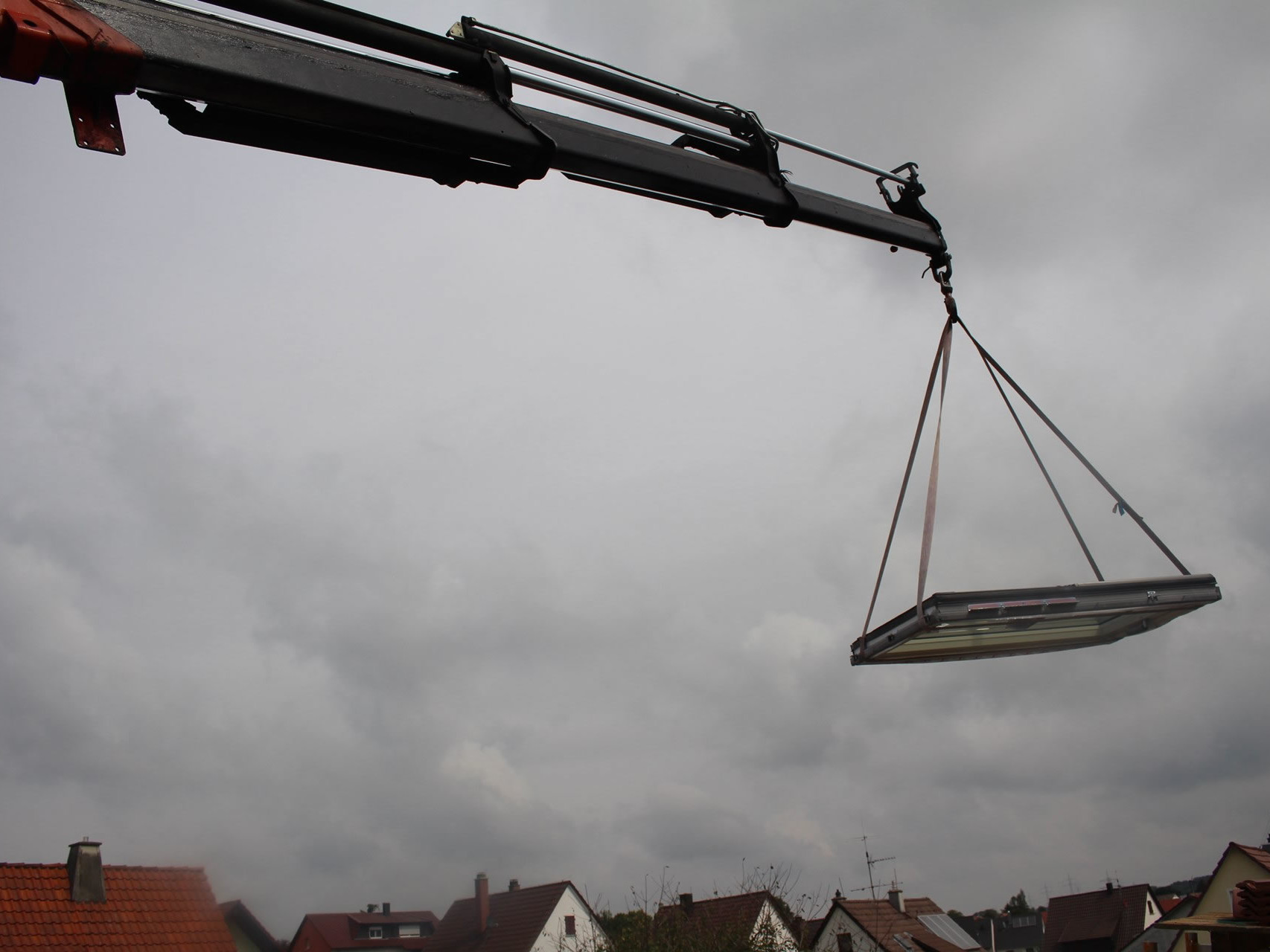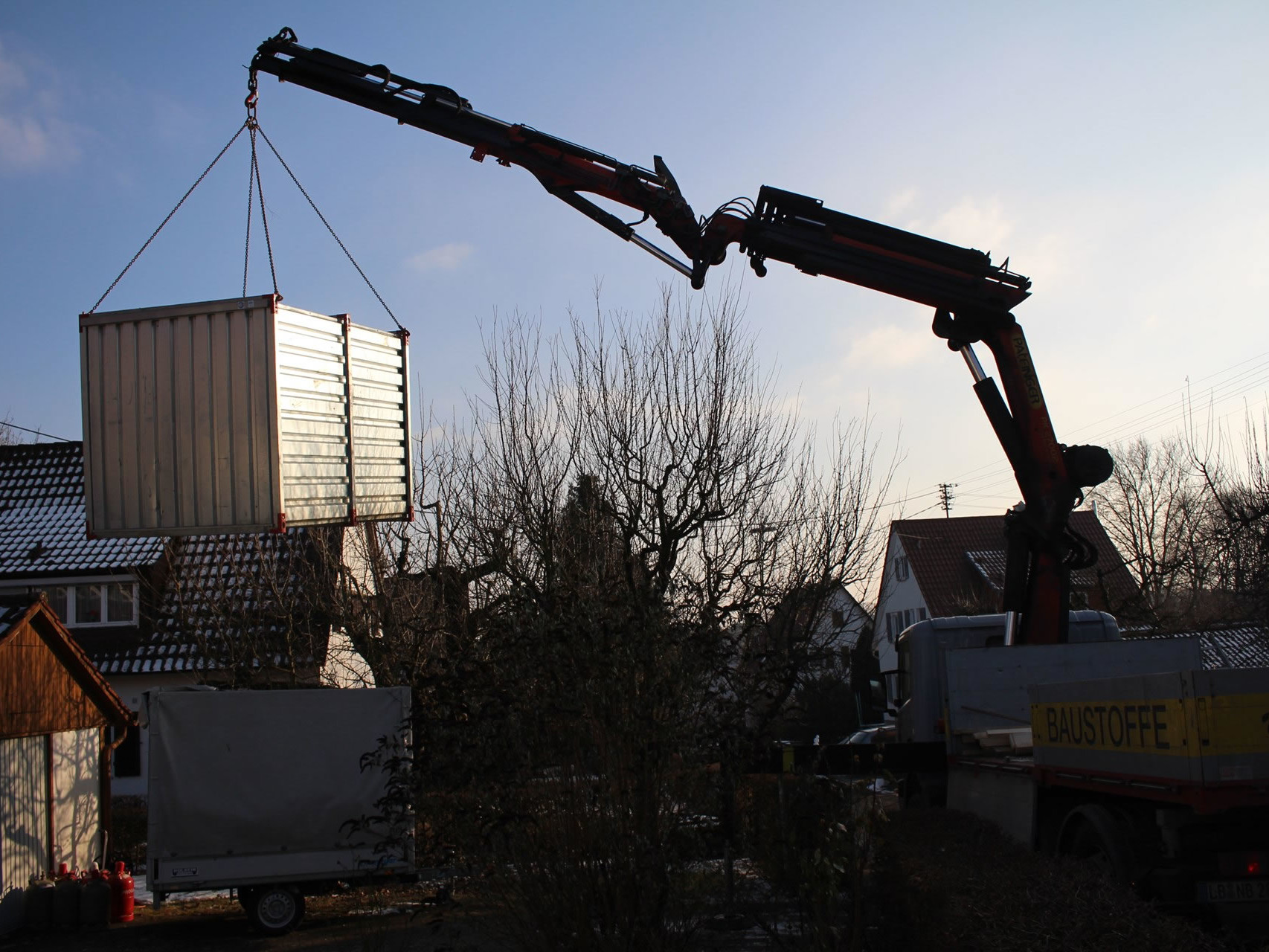 Wir haben einen LKW mit Kran der eine Ausladung von 21 Metern (ab Fahrzeugs- Mitte) hat.