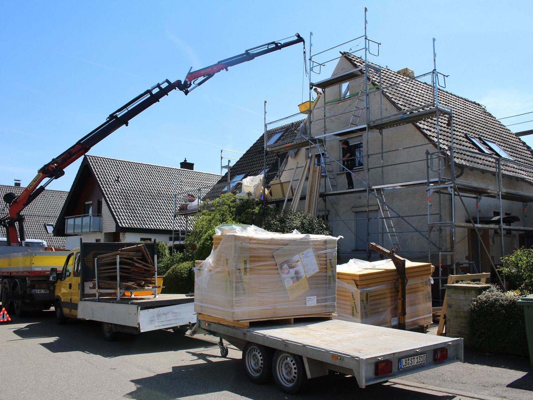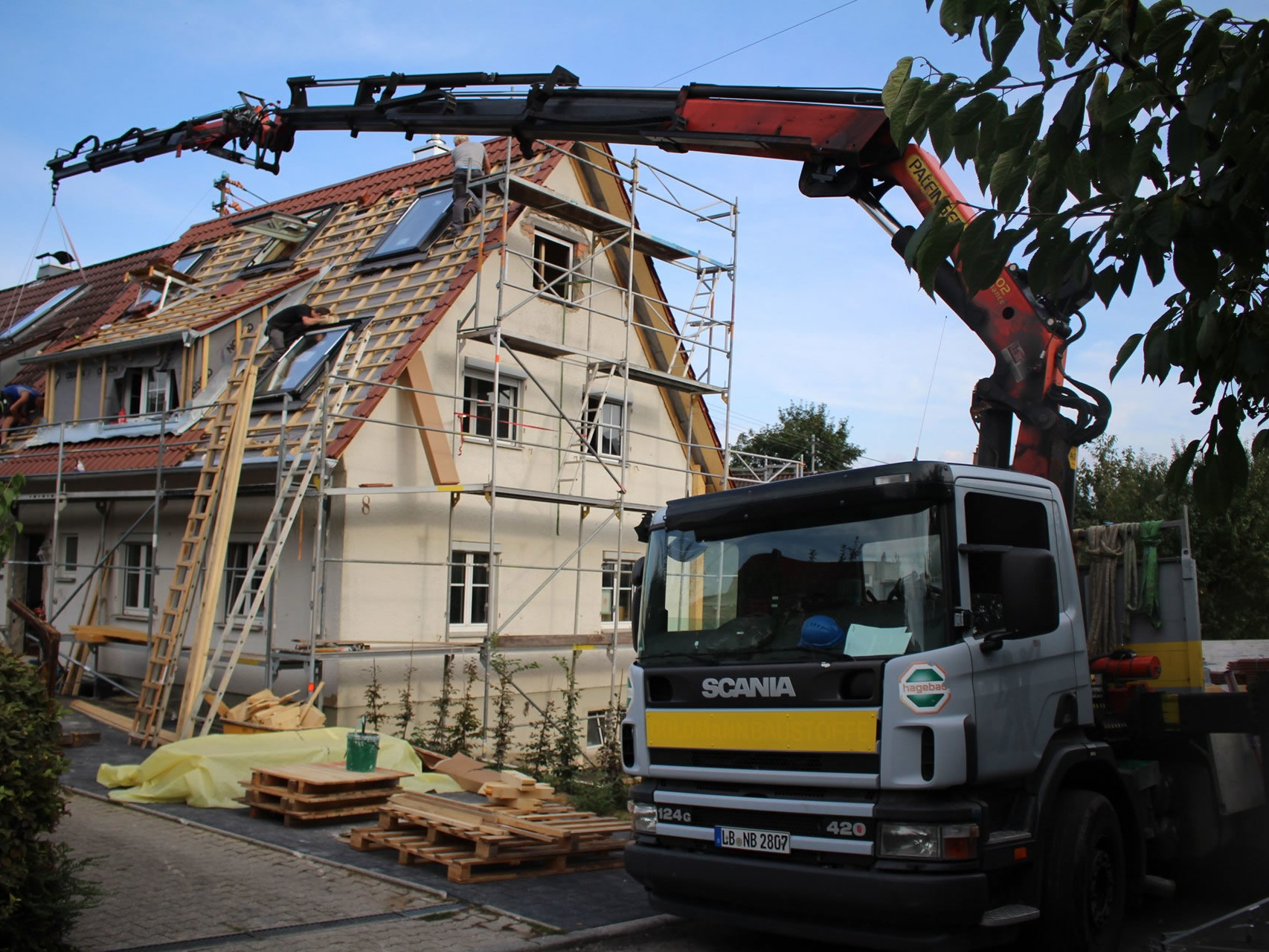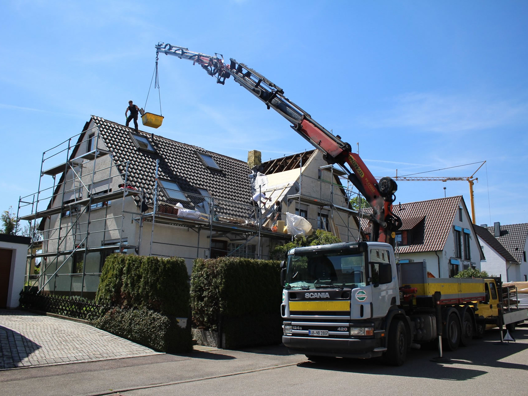 Wir haben einen LKW mit Kran der eine Ausladung von 21 Metern (ab Fahrzeugs- Mitte) hat.